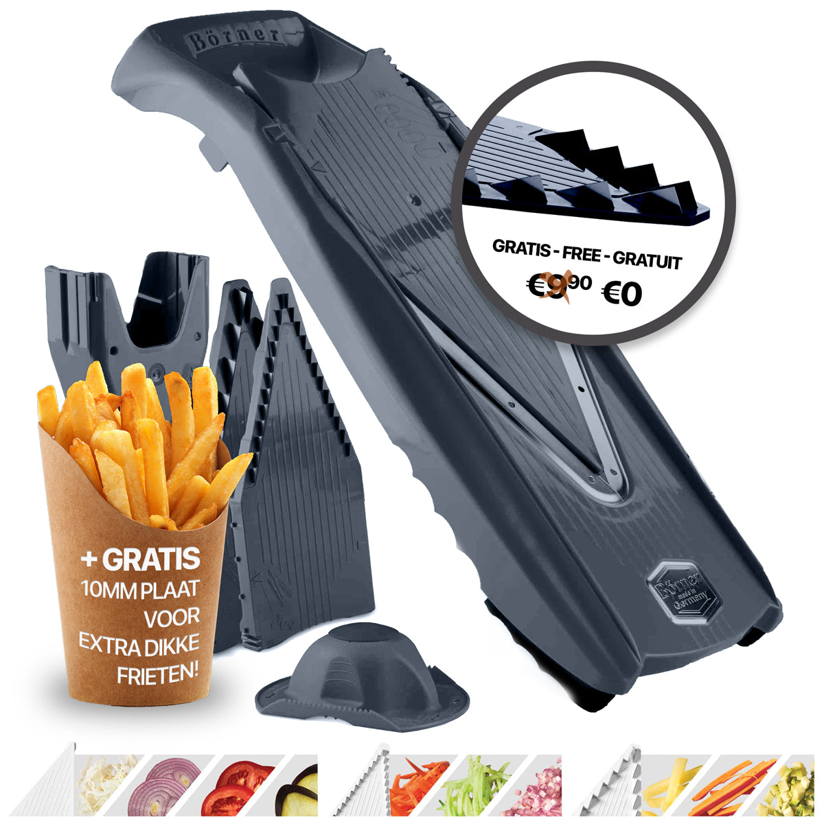 Category: 10MM dikte , borner , Borner Mandoline , Brunoise , cadeau , dikke frieten , Frieten snijden , Julienne , mandoline , Pommes allumettes , PowerLine , Schijfjes snijden in verschillende diktes , slicer , V5 , V5 PowerLine